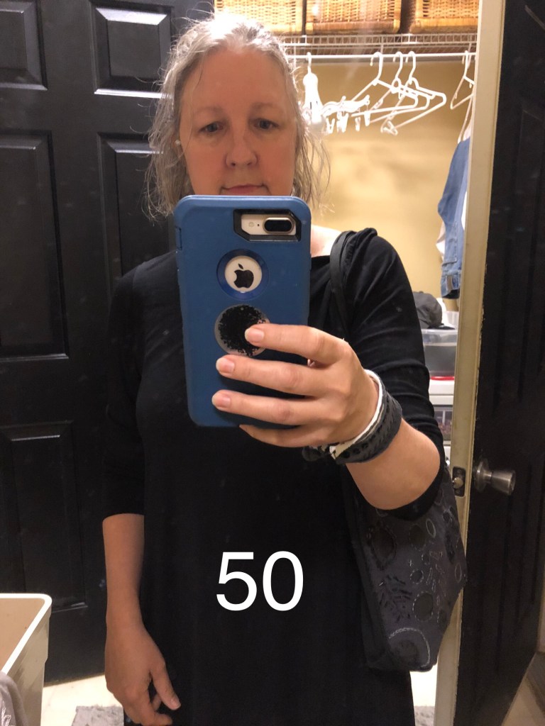 Tuesday May 4 – 50th day – This day was a doozy! My son shredded the tire on his car so I could only grab a picture on my way out the door to go help him, hence the laundry room shot. I didn’t dress up much this day, just threw on one of the cuff bracelets I’ve made. Ironically, the tire and the cuff look a lot a like. Here is the link to my post about cuff bracelets.