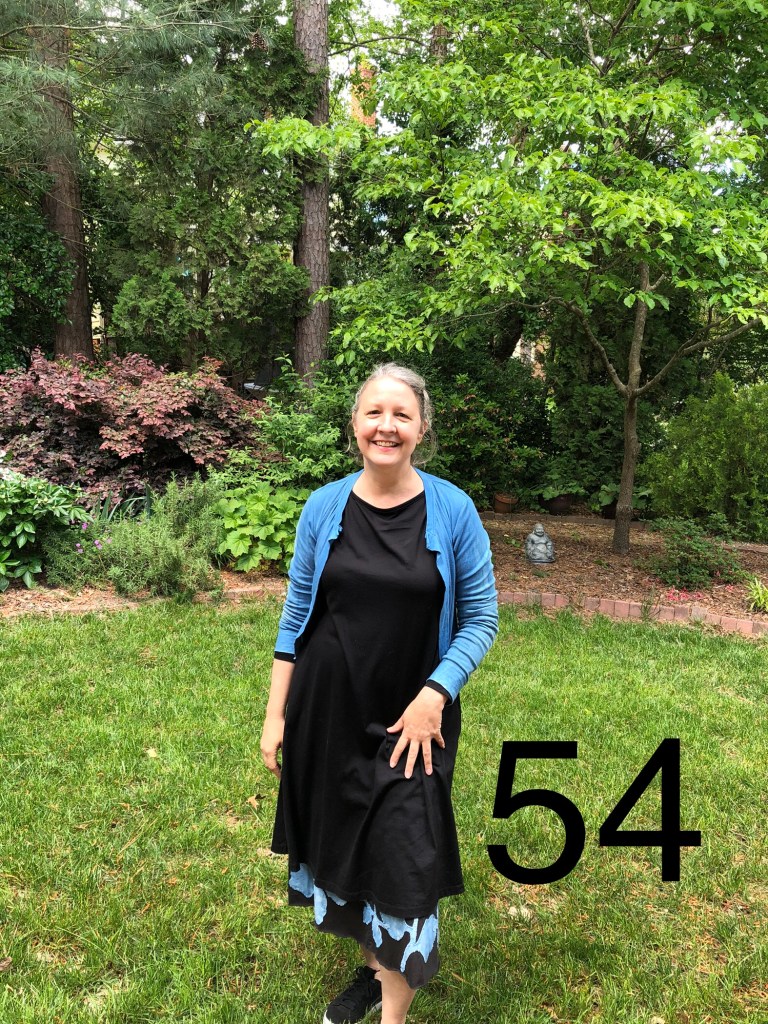 Saturday May 8th – 54th day – Another layering attempt – this time under Ro but it still puts a lot of fabric around my mid section – where I need it the least. The leaves on the underskirt and the cardigan were a part of my first time trying indigo dying. I wrote all about it in my Indigo Experiment blog post.
