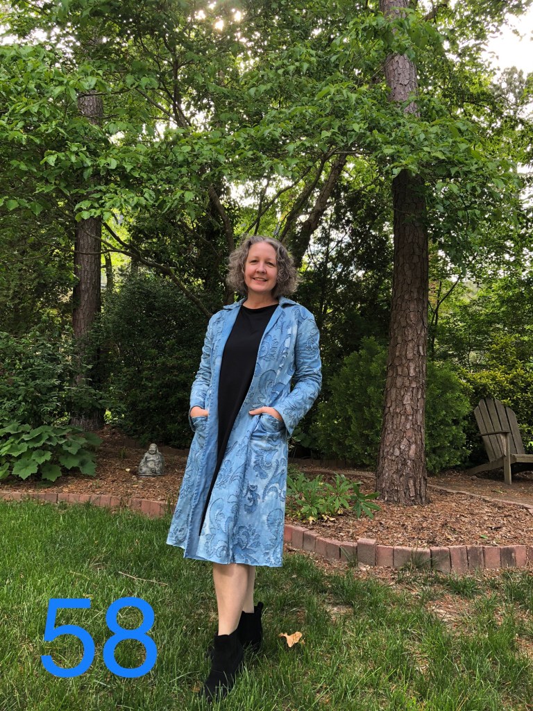 Wednesday May 12th – 58th day – This Indigo Ezra was my Covid quarantine project. I put a lot of blood sweat and tears into this jacket and I still need to write a blog post about it. I dyed the fabric, embroidery thread for the decoration and button craft thread for the assembly. I sponge painted on the Aurora stencil and stitched up in reverse appliqué. Lot’s of lessons learned!! I haven’t put on fasteners so I’m not officially “finished” with it yet.