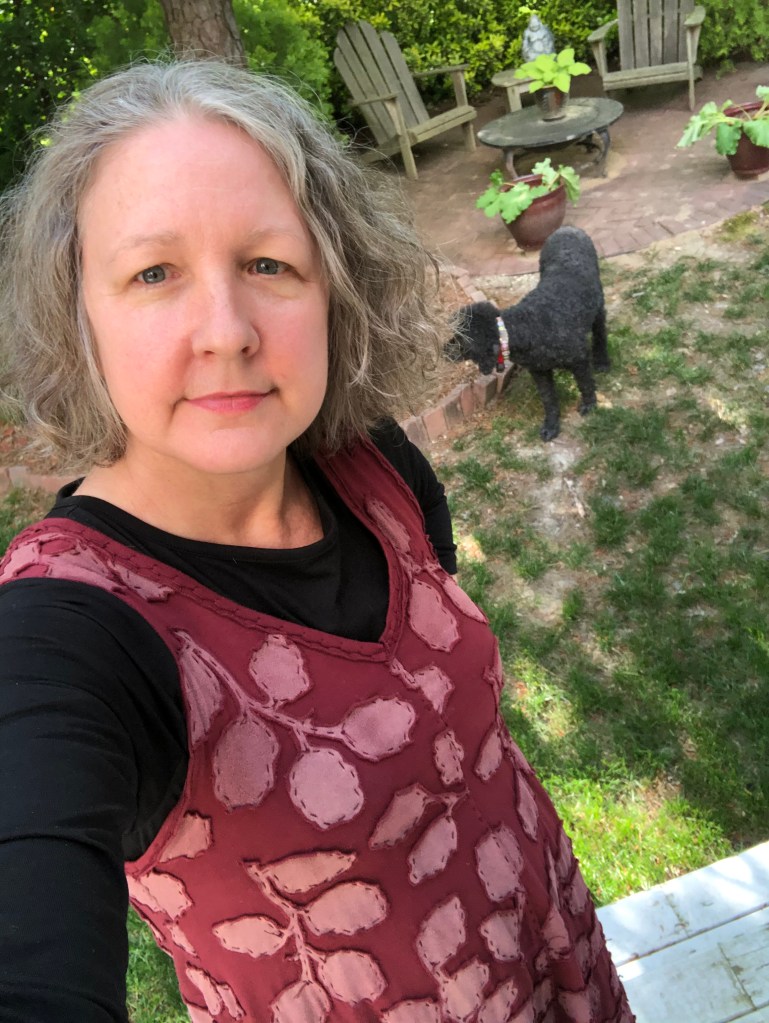 Sunday, May 2nd – 48th day – Back home but headed out to the visit my ex in-laws (yea, that’s a thing). I enjoyed wearing Ro (the dress) as a skirt and pairing it with a MeMade navy tank and navy and black sleeveless bolero. The bolero has the Magdelena stencil in black paint and is worked up in reverse appliqué. It has black binding with a Rosebud stitch. I haven’t written a blog post specifically about it but if you go to my 2019 MeMadeMay wrap up there’s a better picture of it. Side note – the necklace is just a skinny piece of the organic cotton stretched until it wraps with a crystal on it.