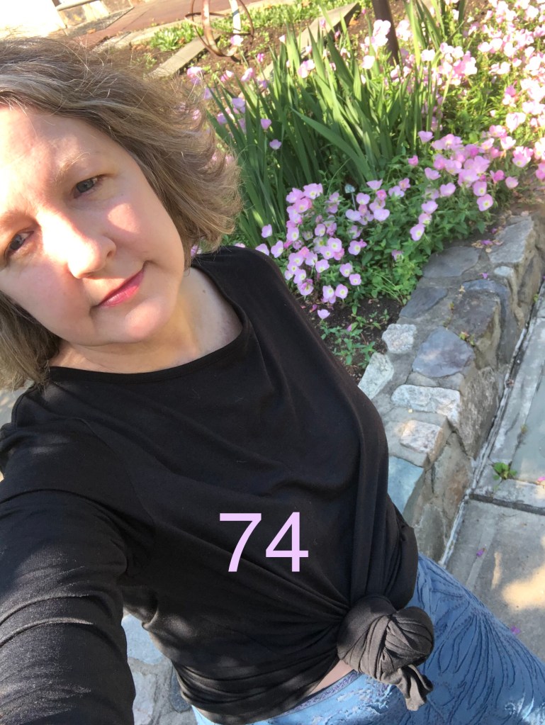 Thursday May 27th – Day 72 – These pictures make me laugh. I took the picture with the number in it first before I realized the pockets on the Ro were inside out (from tying them up the day before). I tucked them in and took a second picture but I decided I liked the untucked picture better – an Insta friend even said she thought I was trying to be avant garde. I’m wearing a plain Peacock camisole and my Black fingerless gloves. Here is the blog post about the fingerless gloves.