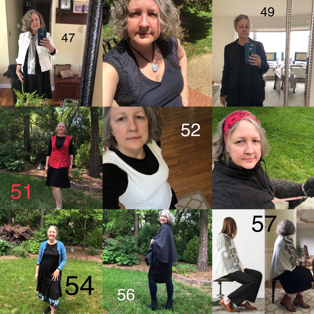 I missed the last two days in May. I was back at my house and working to get ready to move. As tough as it was to do two challenges at once, it really did help me realize what it is I really want to wear and what I need to let go of. And taking selfies everyday has helped me realize what looks good on me …. and what doesn’t.