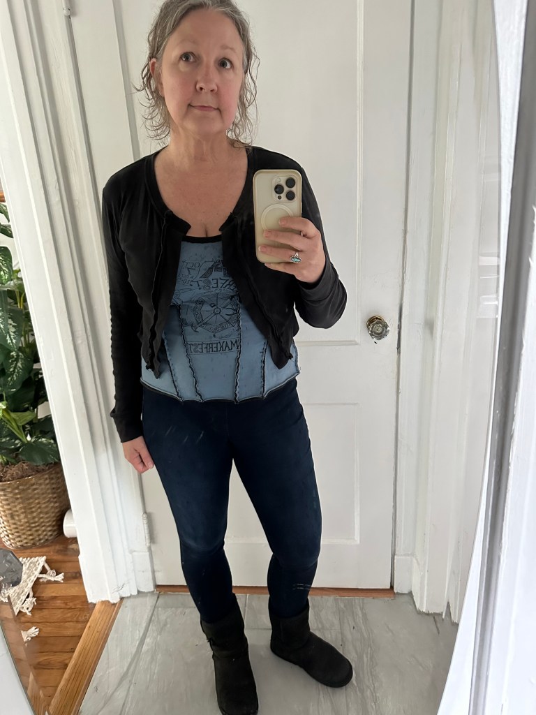 Corset in a personal T-shirt over black fabric (which makes it reversible) and black binding, Black button craft thread in cretan stitch on binding and outside seams