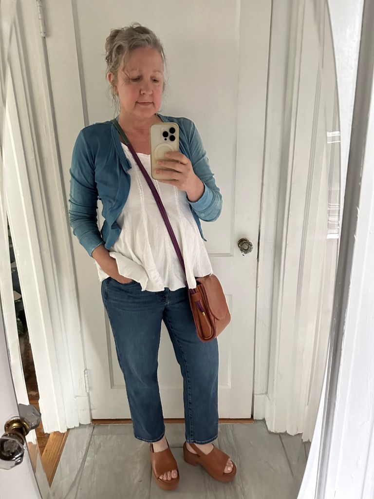 This sweater is the Betty from Sezane in Navy with hand embroidery on the pockets and sleeves. Sezane is a wonderful French sustainable fashion brand with classic pieces. I was originally wearing the Rose Wrap Cardigan this morning but it was pouring down rain and I was soaked through and had to change before the Chem school graduation later that day.