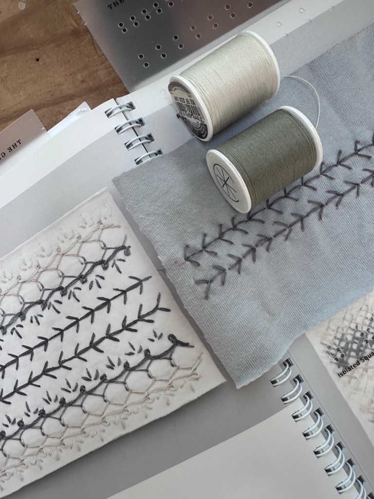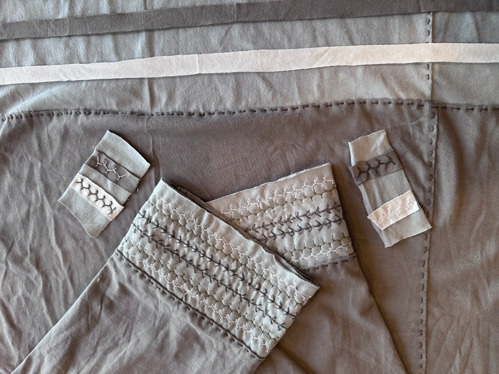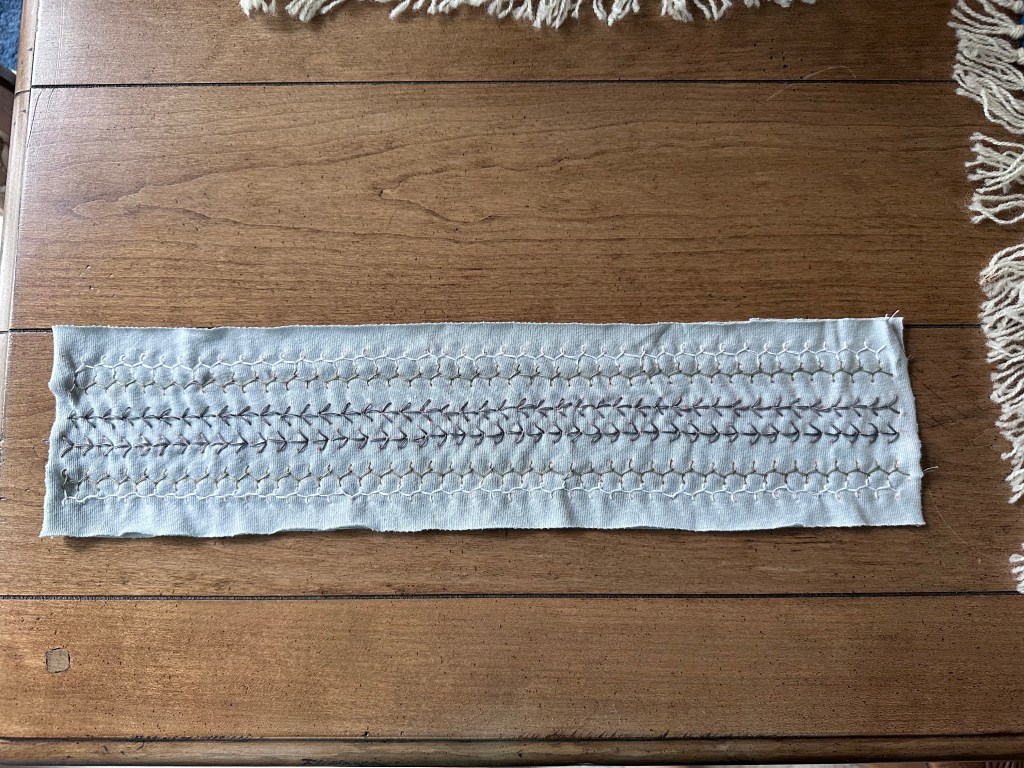 It took me a while to decide which color thread I wanted to use on the stripes. I even made up a few samples to decide if I wanted contrasting stitches or blending – in the end I decided to use Sage thread for both the White and the Dove stripes.