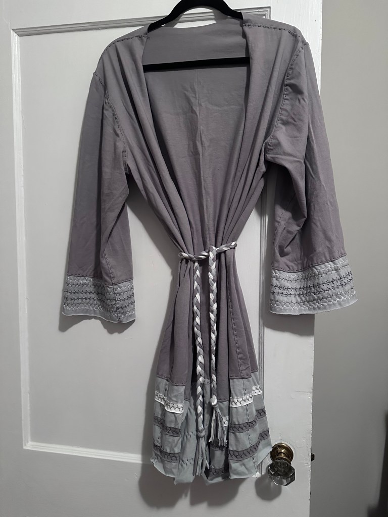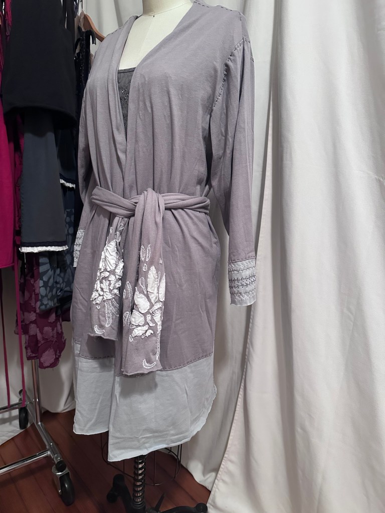 *Note, the scarf was just added to keep the robe closed for this picture. The scarf is Dove with White Angie’s Falls relief appliqué – my first time trying that technique. There is also some chain stitching on the stencil – this scarf was a true experiment as it was one of the first things I ever airbrushed. Here a link to the blog post I wrote about the scarf and the lessons I learned about relief appliqué.