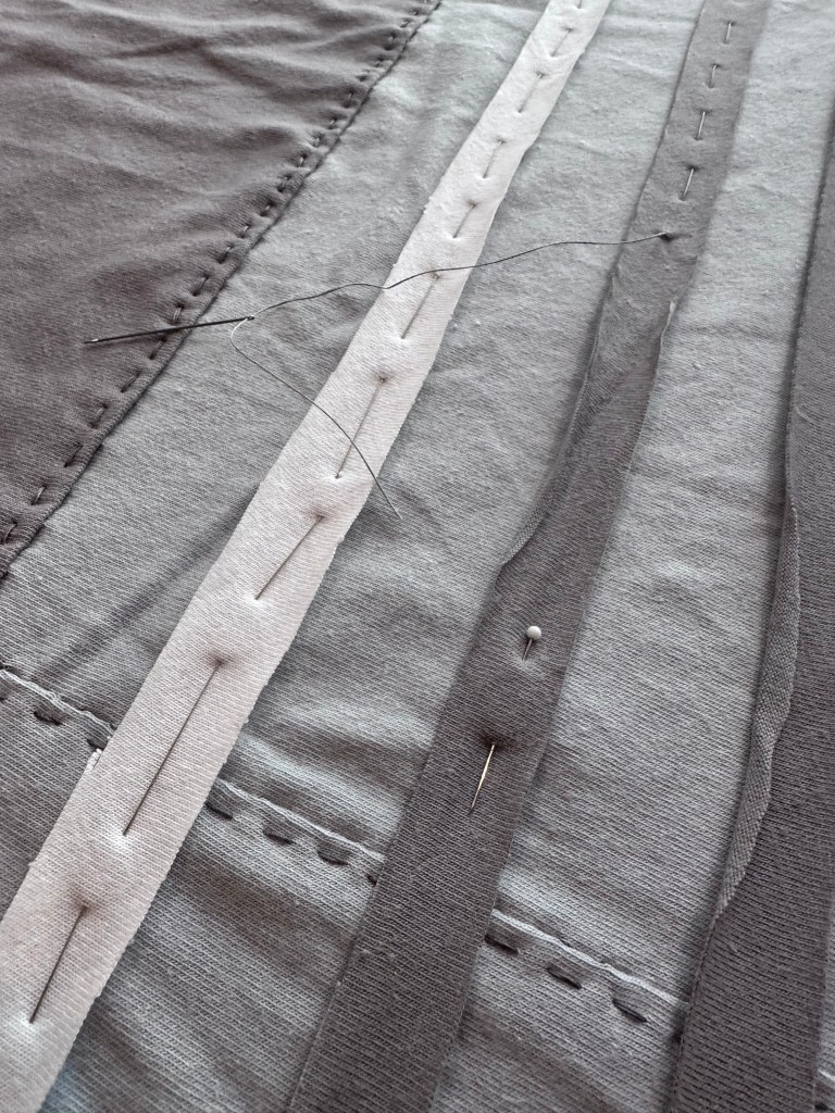 Since the stripes were so long, the first thing I needed to do was to baste them to the robe, measuring as I went to make sure they were straight