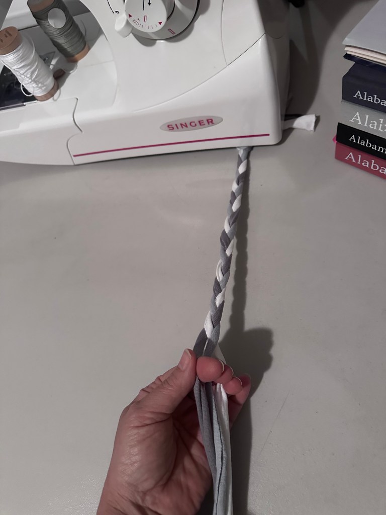 Once that was finished I actually wore the robe some before I realized it needed two more things: a belt and loops to keep it closed and a inside loop to be able to hang it on my bathroom door. To make the belt, I just braided some extra scraps of Dove, Light Blue and White I had laying around